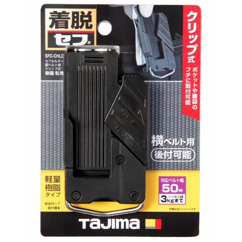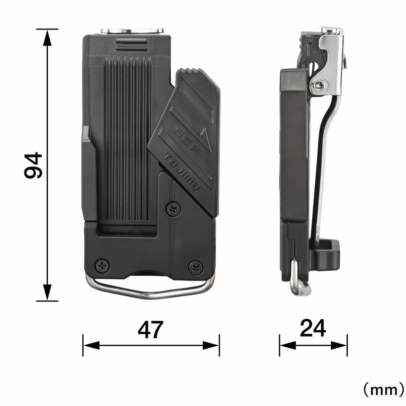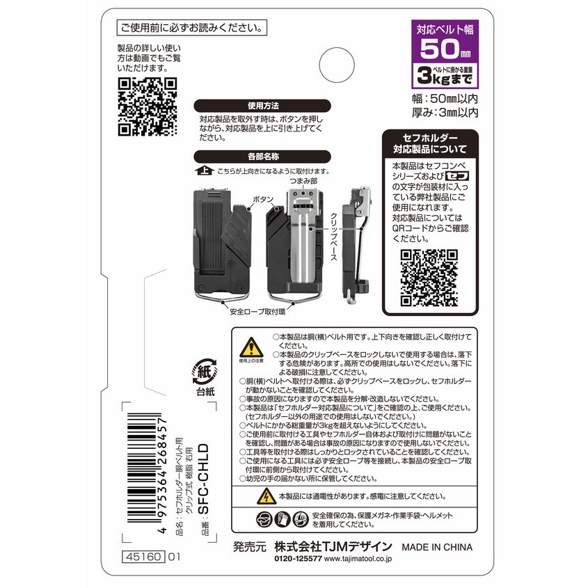 規格 尺寸:寬 47 毫米 深 24 毫米 高 94 毫米 重量:60克 材質:主體 ABS 樹脂、夾鋼、按鈕 POM 樹脂、安全繩固定環不鏽鋼 適用腰帶:軀幹(水平)腰帶 *寬度50mm以內 厚度3mm以內 皮帶重量:最多 3 公斤 按鈕位置: 右側按鈕 安裝方式:夾子式 *具有防止脫落的滑動鎖定機構(安裝在腰帶上時),可安裝在口袋、腰包等上。