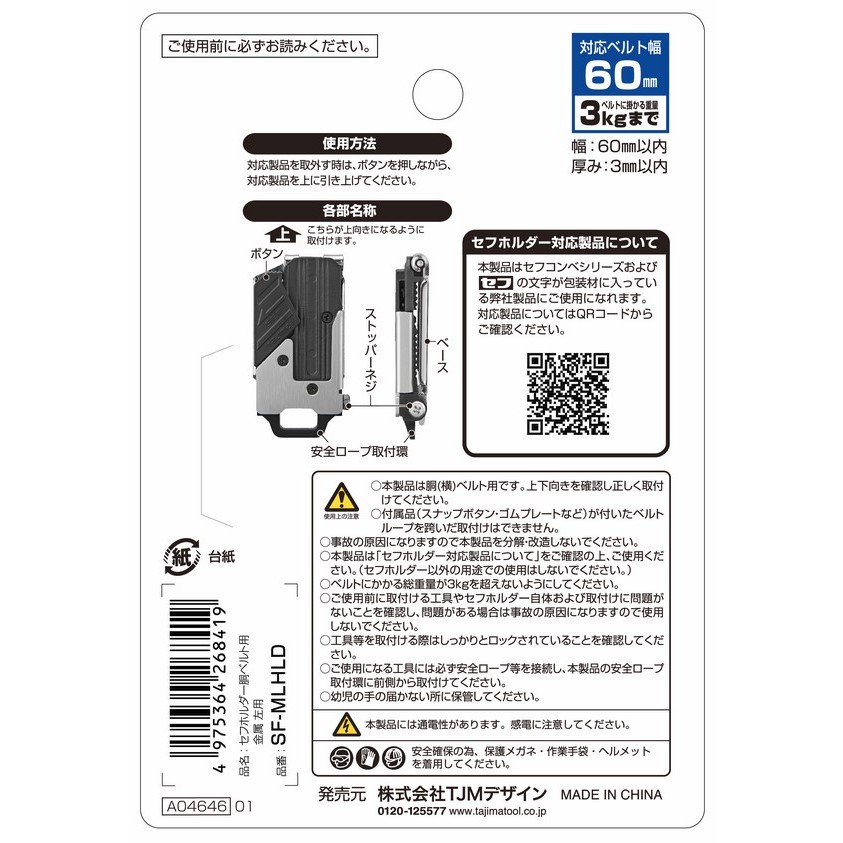 適用腰帶:軀幹(水平)腰帶*寬度在60毫米以內,厚度在3毫米以內(跨騎在腰帶環上時,腰帶寬度為53毫米或更小)